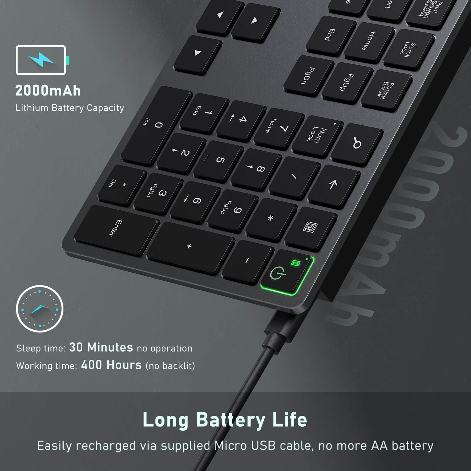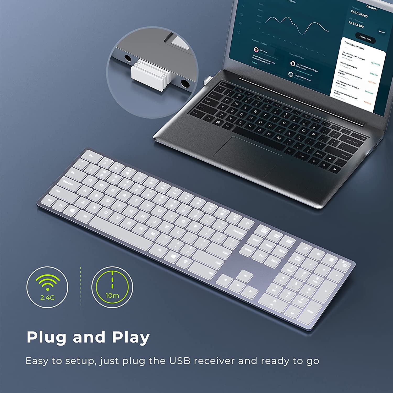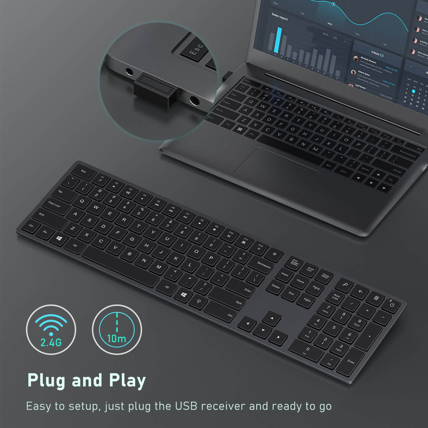 Just plug it into a USB port and your keyboard is ready to go. The powerful 2.4G frequency provides you with a stable wireless connection, you will never experience "lag" problem with it.